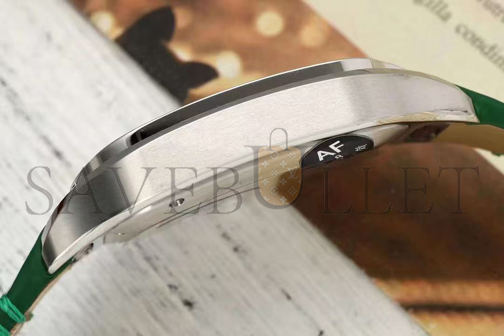 self-winding mechanical movement, calibre 1847 MC. Steel case, 7-sided crown set with a faceted blue synthetic spinel, gradated green dial, polished steel sword-shaped hands with luminescent material, sapphire crystal. Steel bracelet with SmartLink smart size adjustment system. Second green alligator strap with steel folding interchangeable buckle. Both straps are equipped with QuickSwitch interchangeability system. Case width: 39.8 mm. Thickness: 9.38 mm. Water-resistant to 10 bar (approx. 100 meters).