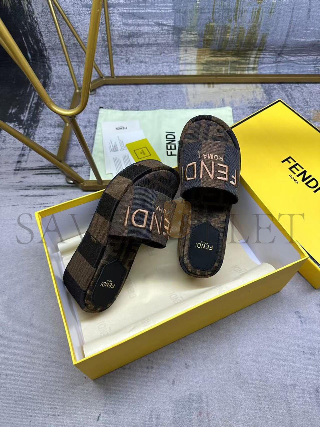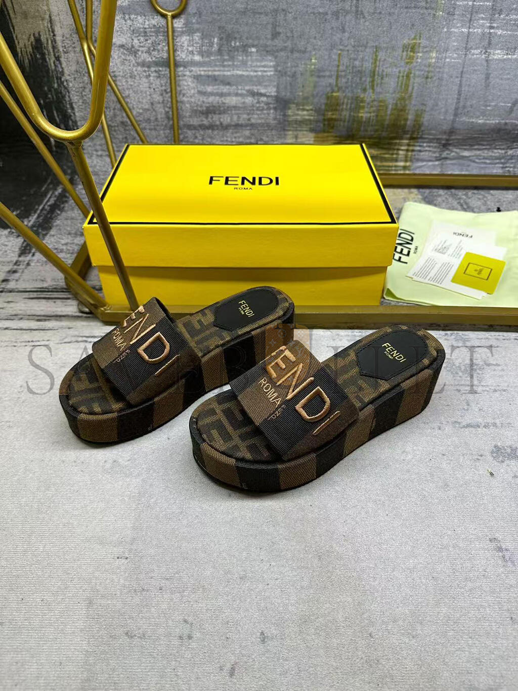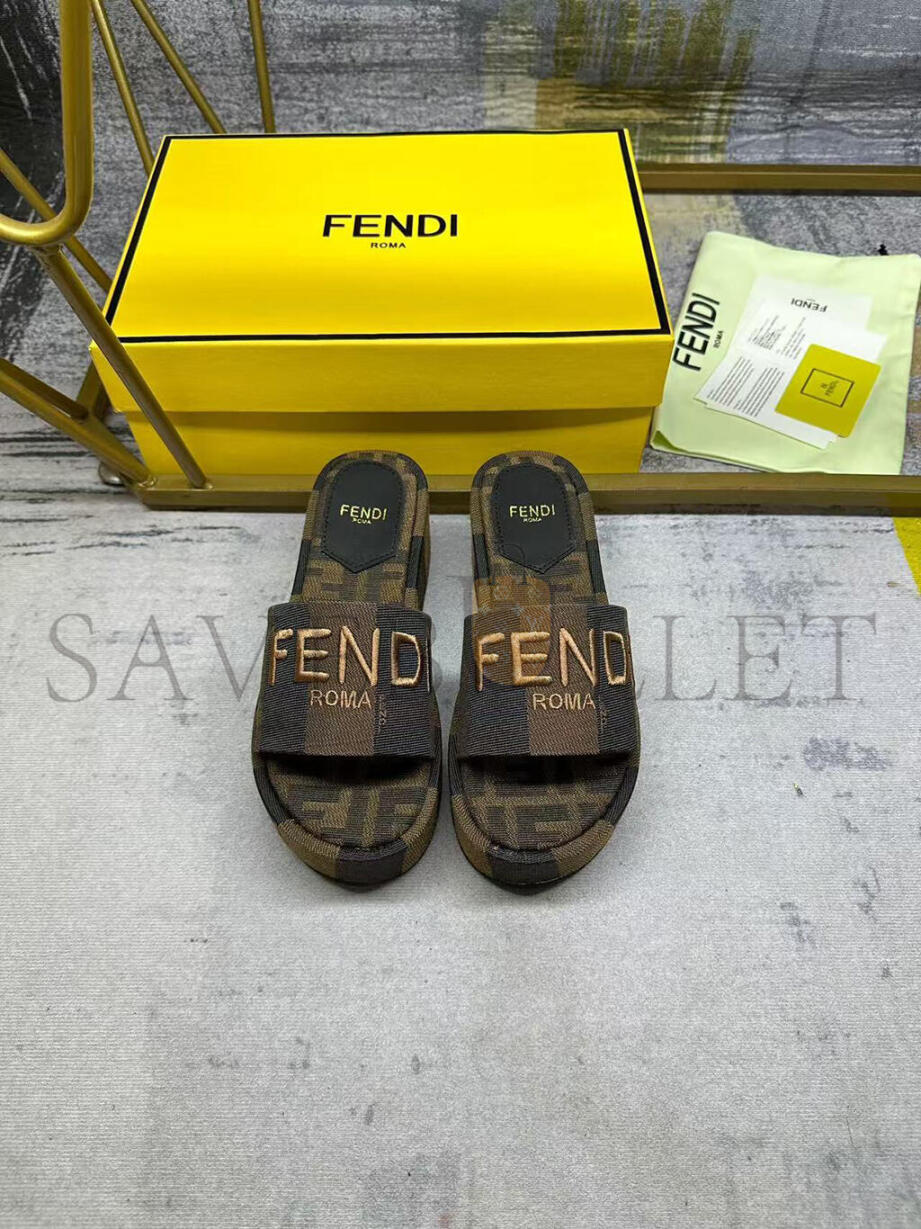 FENDI SUNSHINE BROWN FABRIC FLATFORM SLIDES 8R8515AORHF1P95