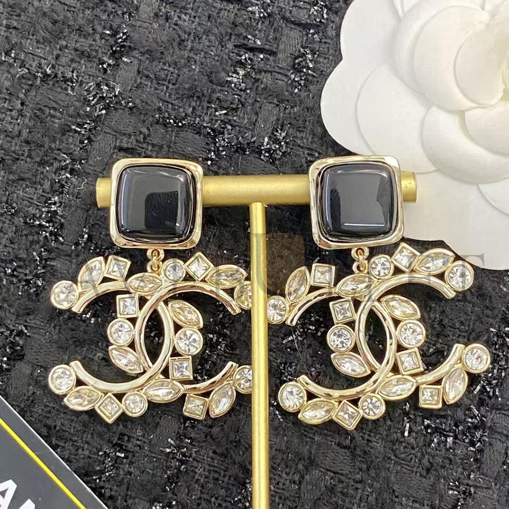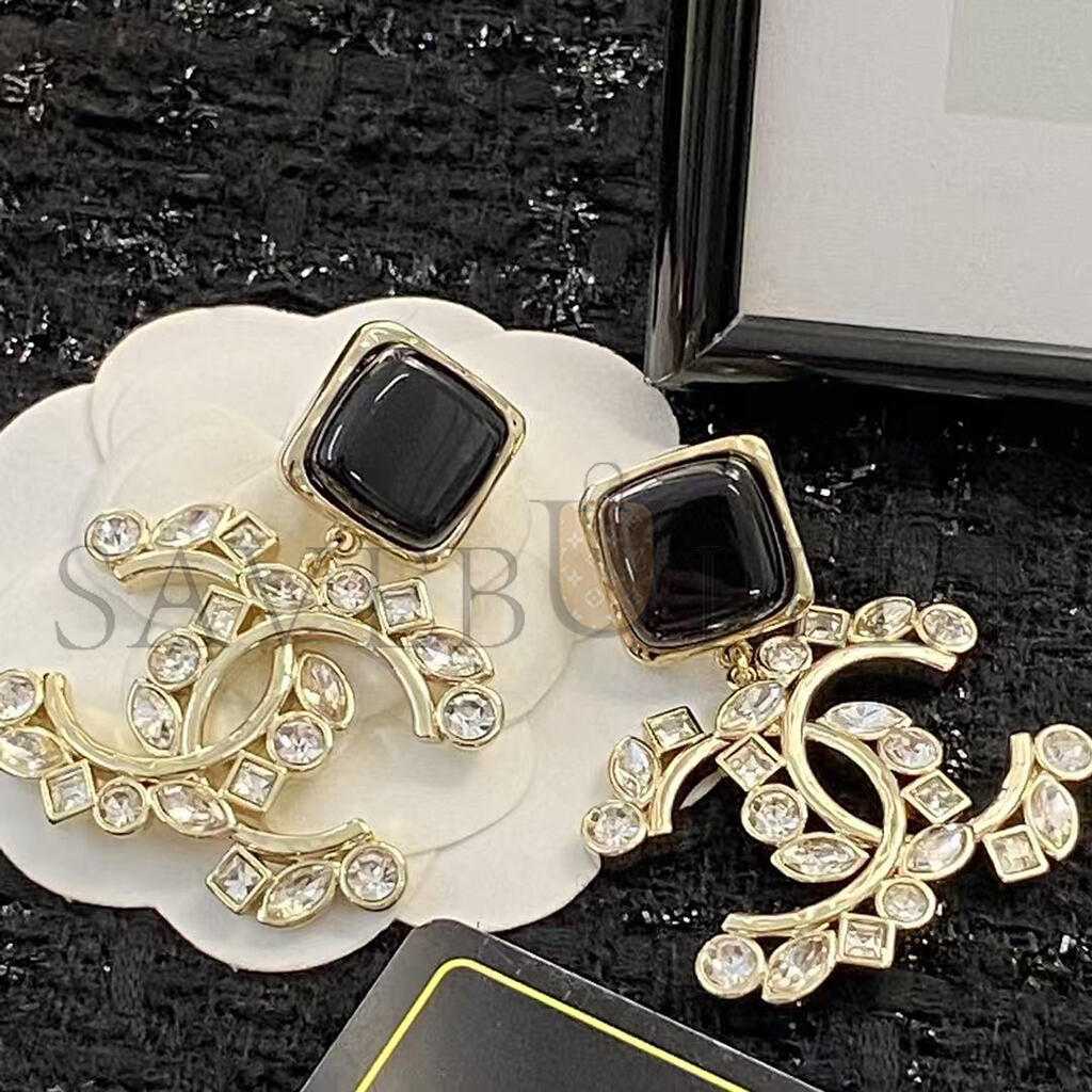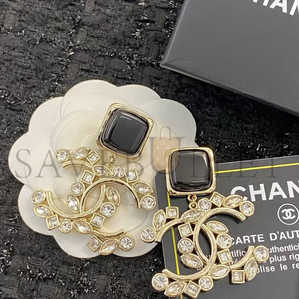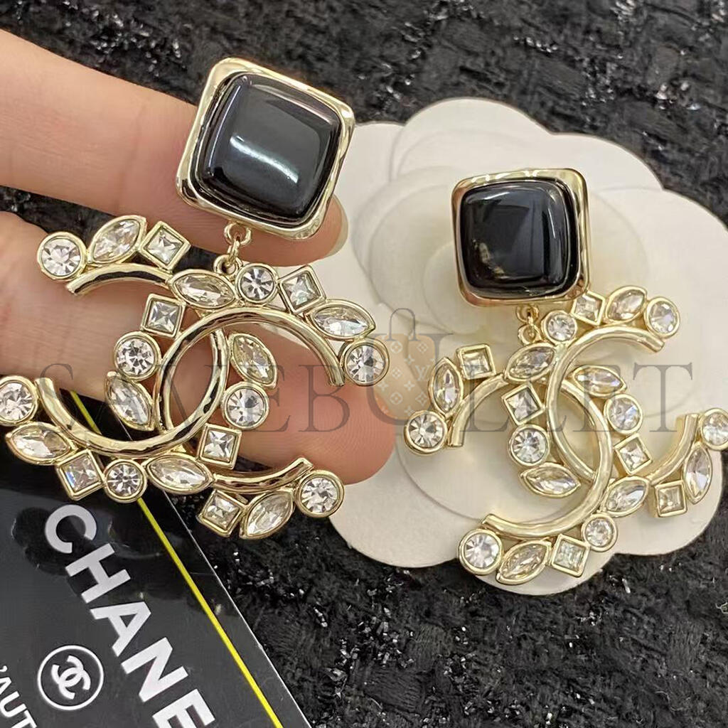 CHANEL 23P PENDANT GOLD CRYSTAL BLACK CC LOGO XL STATEMENT STUD DROP EARRINGS