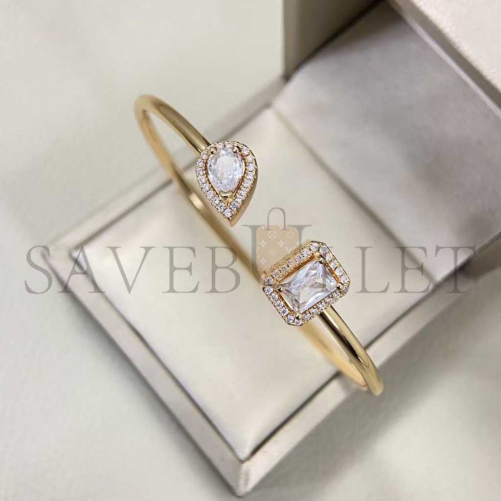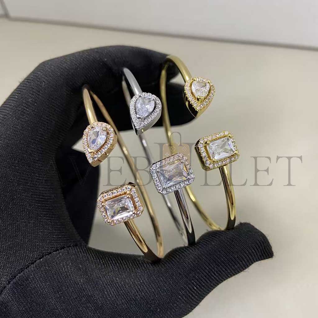 Ce bracelet jonc diamant en or rose 18 carats My Twin réalisé s'adaptera avec souplesse à votre tour de poignet. Tout en finesse, discret et élégant, ce jonc d'or ouvert sur le dessus du poignet met en face à face un diamant taille poire de 0,15ct et un diamant taille émeraude de 0,15ct, pierres signatures de la collection de joaillerie My Twin. Entre sensualité et éclat, les deux pierres semblent vouloir se toucher sans y parvenir. A porter en toute occasion, ce bracelet jonc diamant en or rose se mariera avec les autres bracelets de luxe Messika ou avec vos bracelets porte-bonheur. Son or rose chatoyant, alliage développé spécifiquement par la maison Messika, apportera douceur et lumière au poignet.