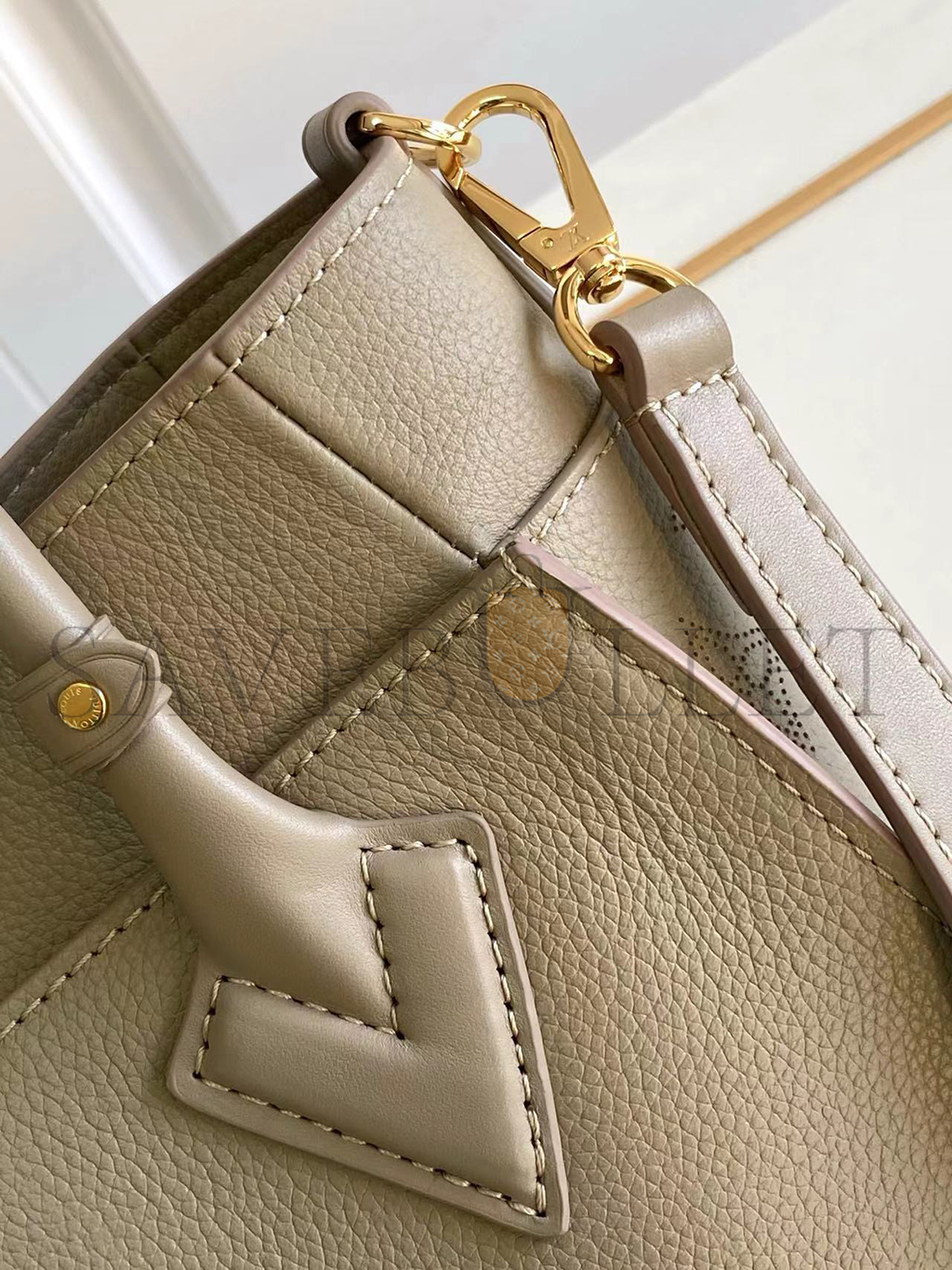The On My Side PM tote bag is made from calf leather in a soft gray colorway, with sides in Mahina calf leather and its perforated Monogram pattern. Functional, this tote has two outside pockets for quick access to essentials. Two top handles and a removable strap enable shoulder or cross-body carry.