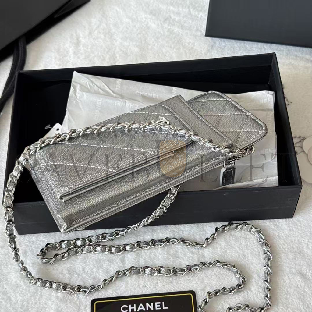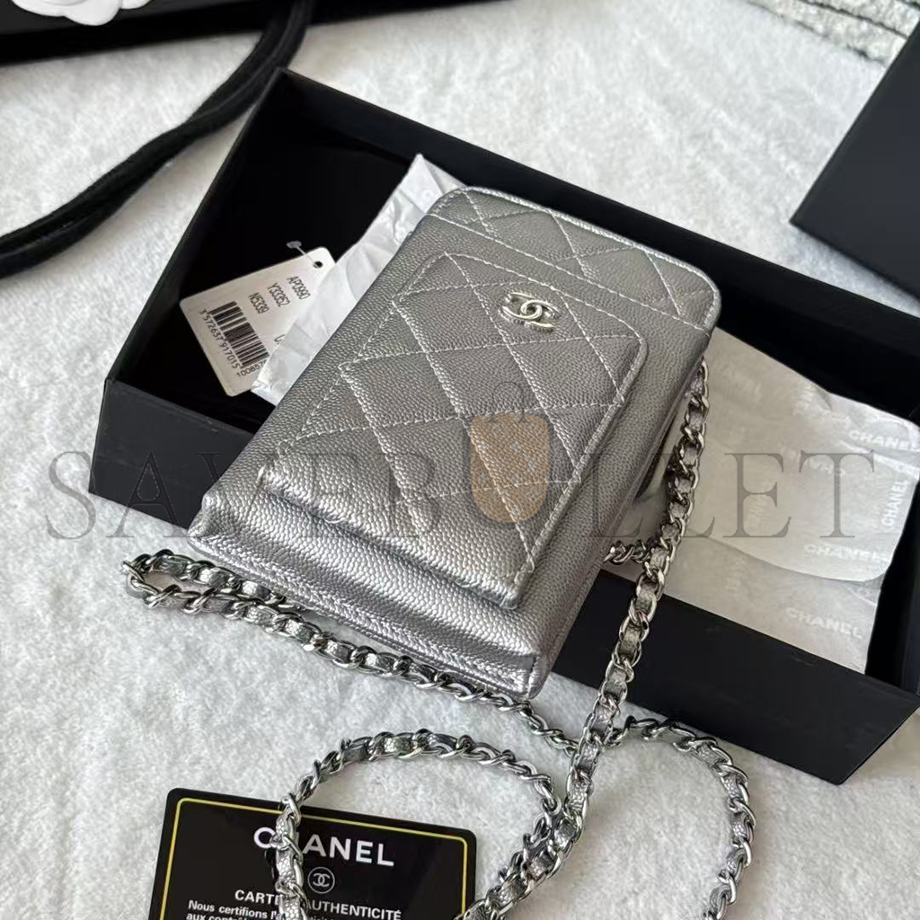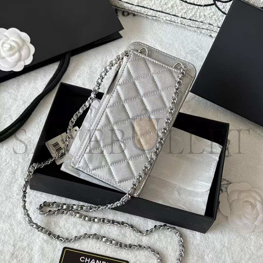 CHANEL CAVIAR QUILTED CC PHONE HOLDER METALLIC SILVER AP0990 (18*10*3cm)