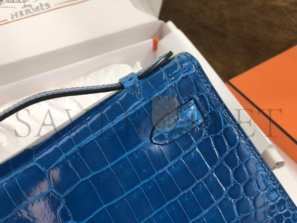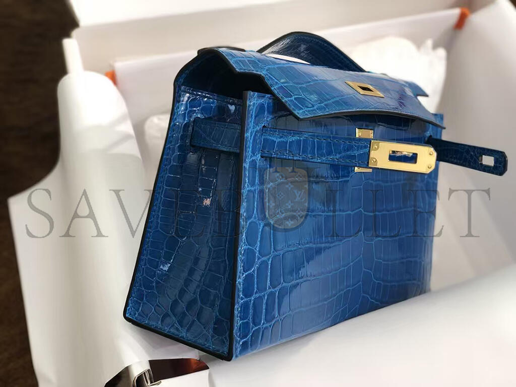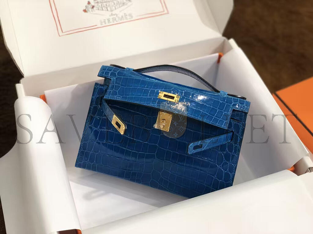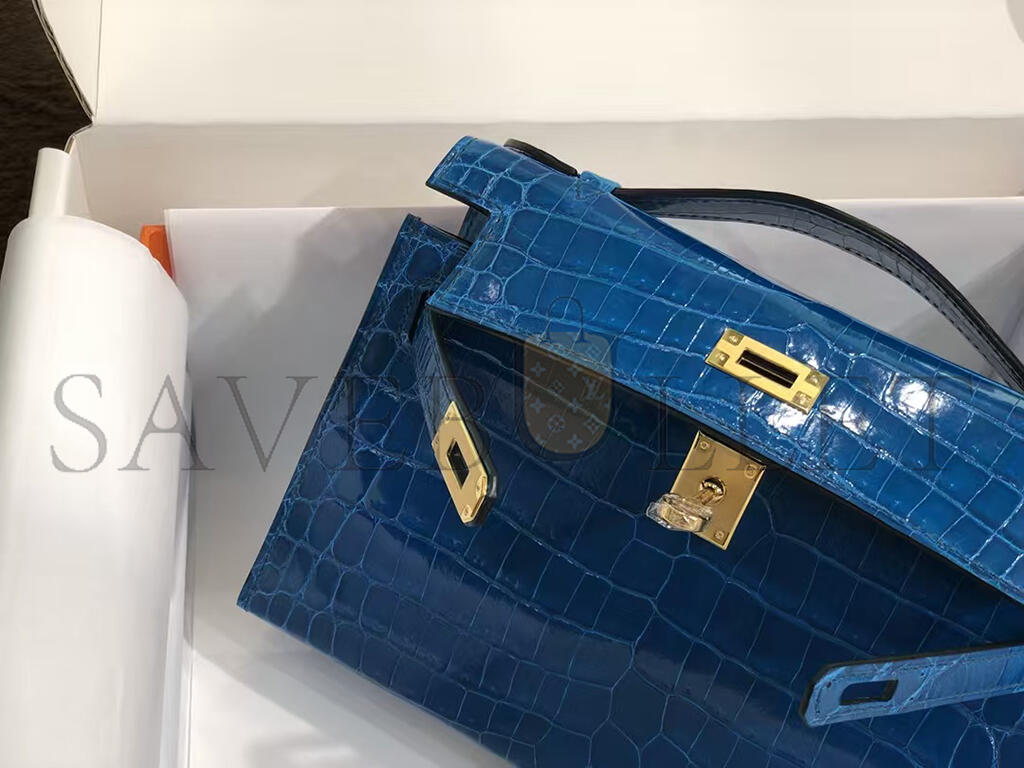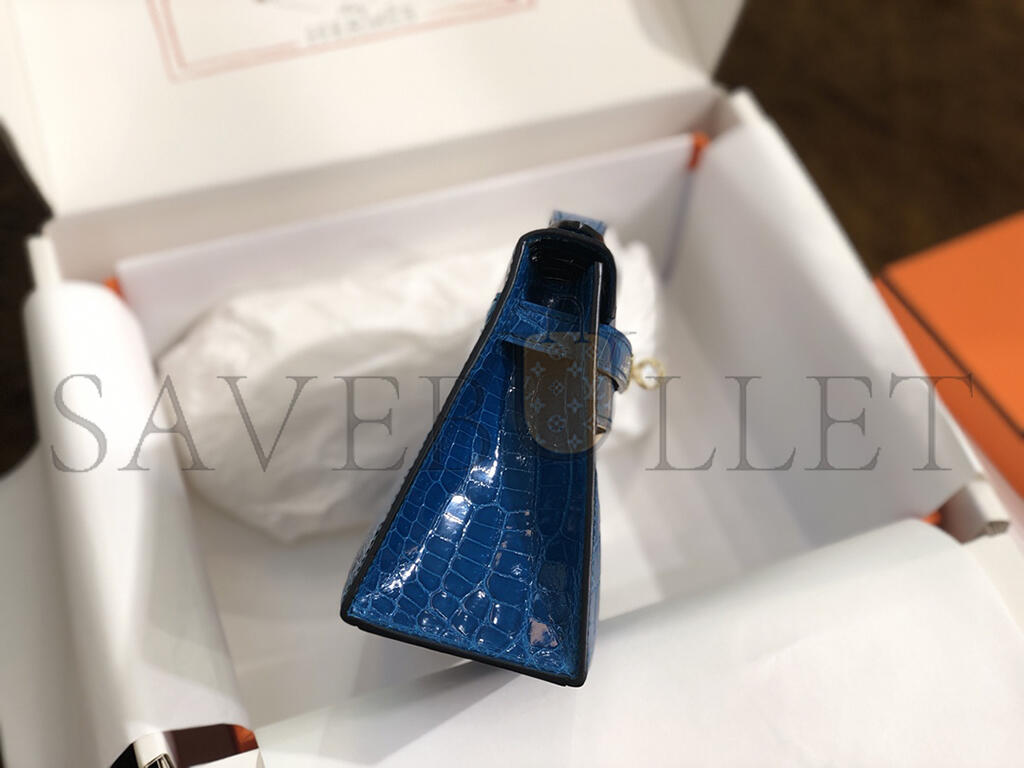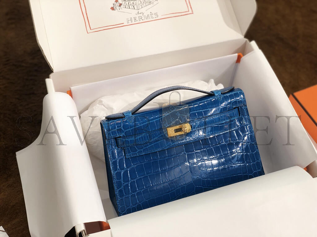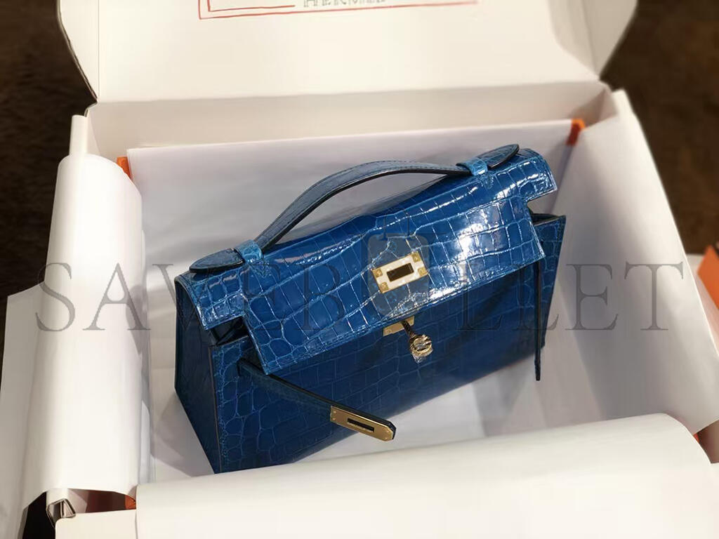 HERMES MASTER KELLY POCHETTE BLEU MYKONOS ALLIGATOR GOLD HARDWARE (22*14*7cm)