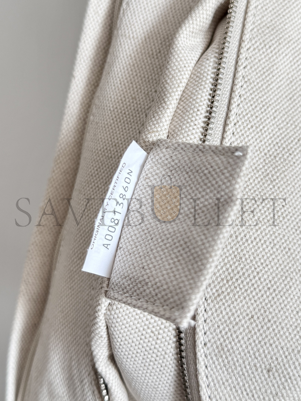 Organized canvas interior composed of one zipped compartment and one strapped compartment featuring a detachable divider with a flat zipped pocket