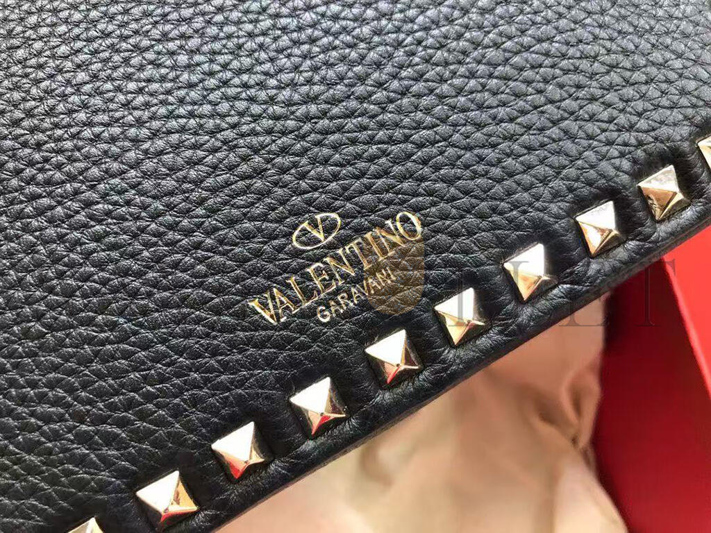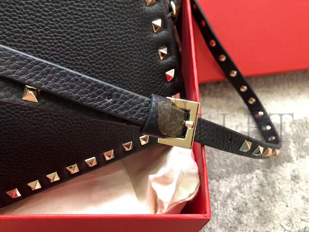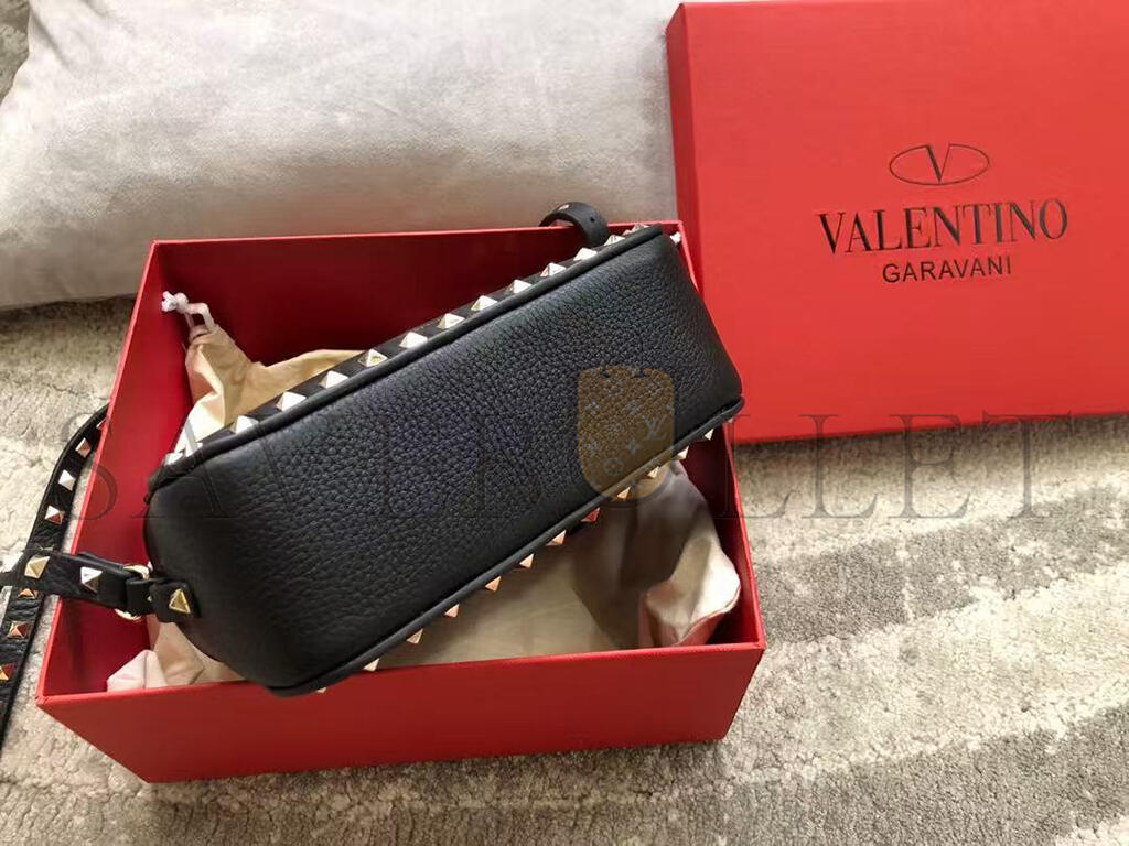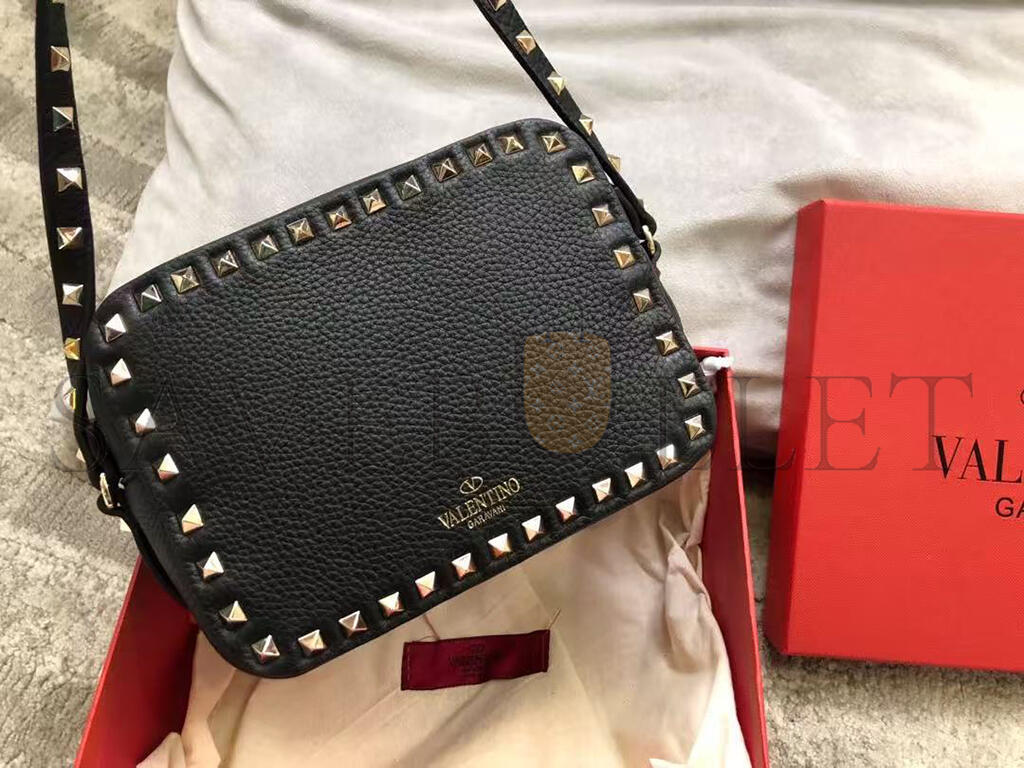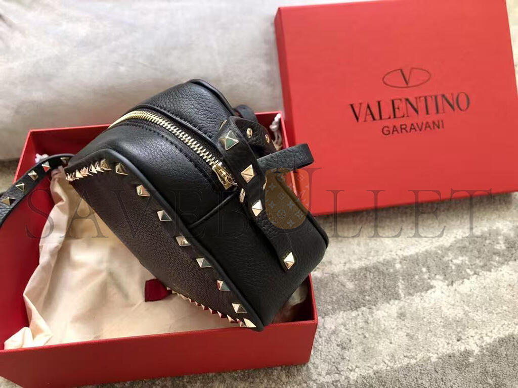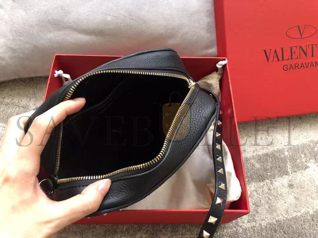 VALENTINO GARAVANI PEBBLED CALFSKIN ROCKSTUD CAMERA CROSSBODY BAG BLACK 168173 (18*13*8cm)