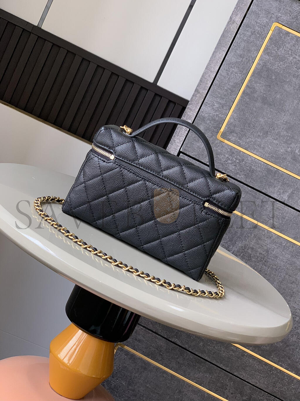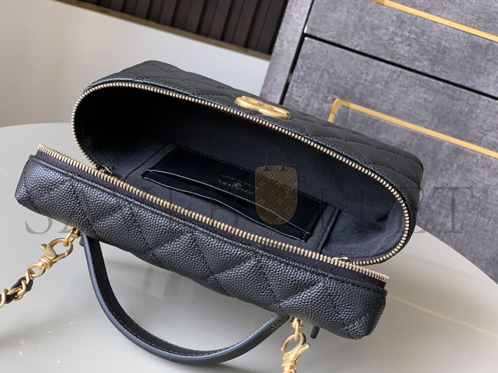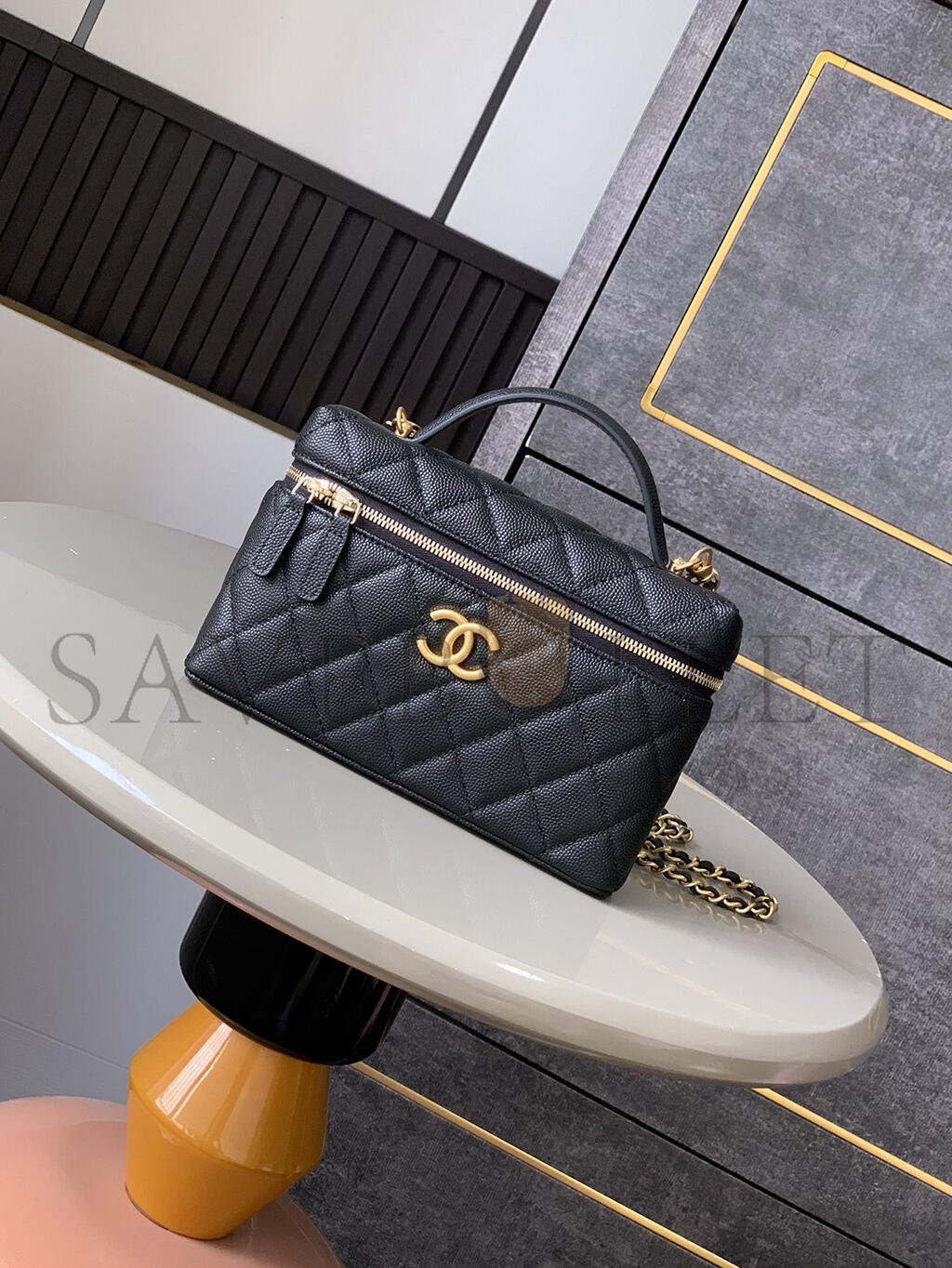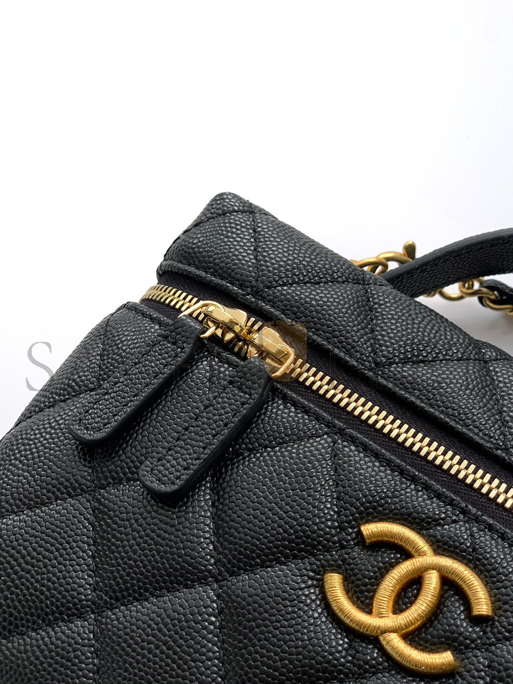 CHANEL CC TOP HANDLE LONG VANITY CASE WITH CHAIN SHINY CAVIAR LIGHT GOLD HARDWARE BLACK AP4385 (19.5*17*5cm)
