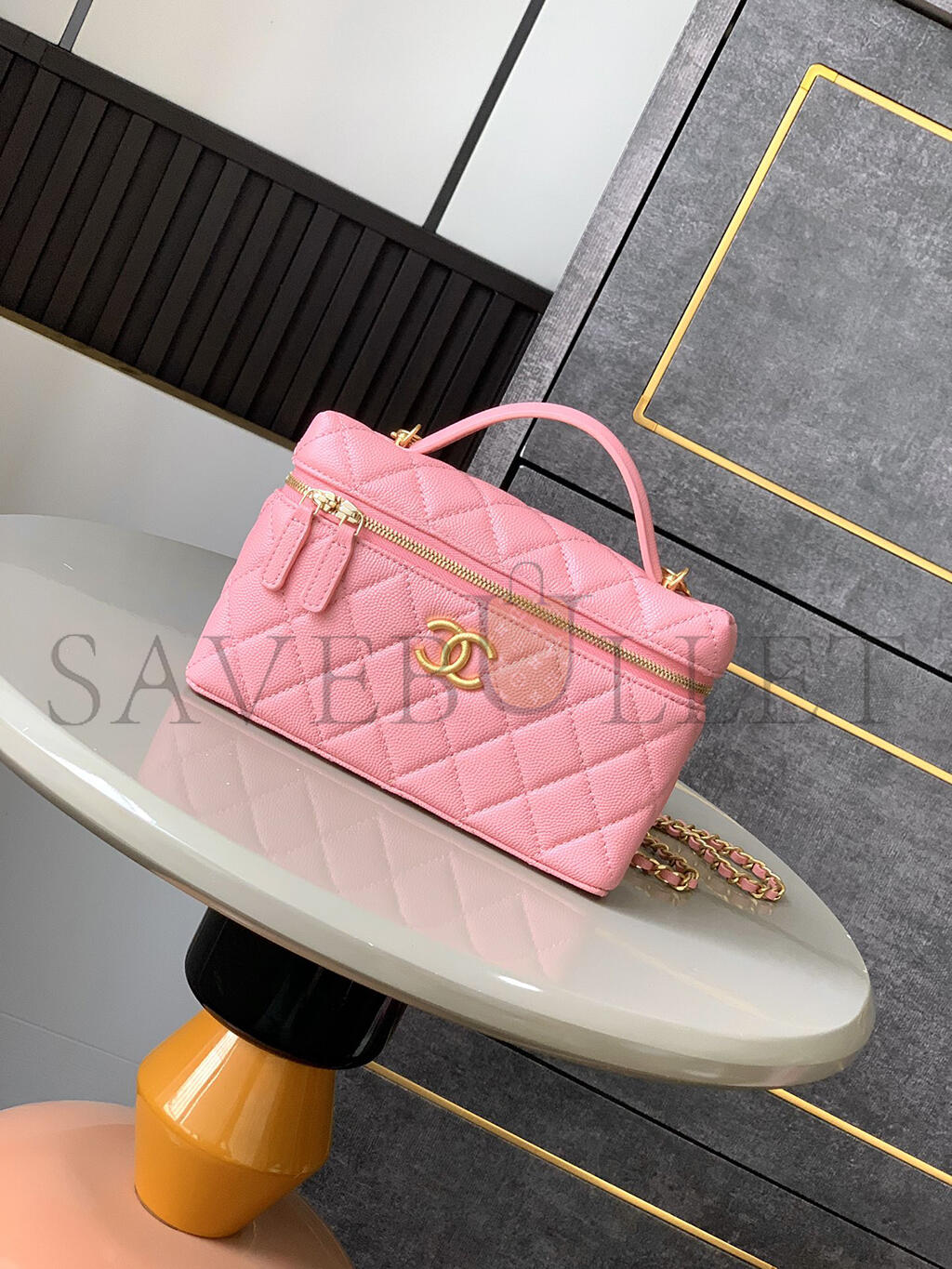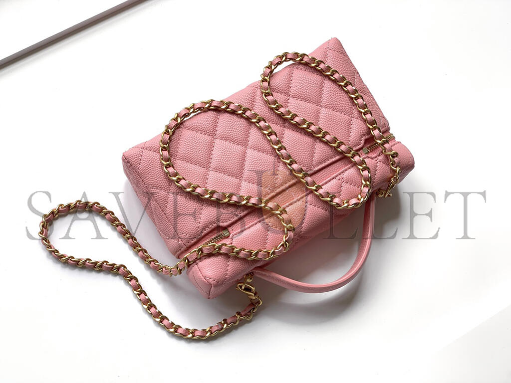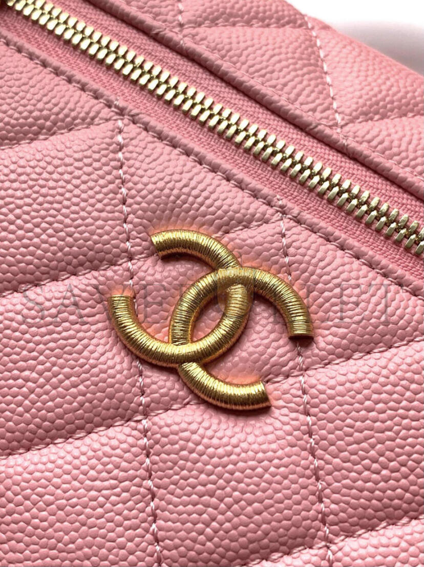 CHANEL CC TOP HANDLE LONG VANITY CASE WITH CHAIN SHINY CAVIAR LIGHT GOLD HARDWARE PINK AP4385 (19.5*17*5cm)