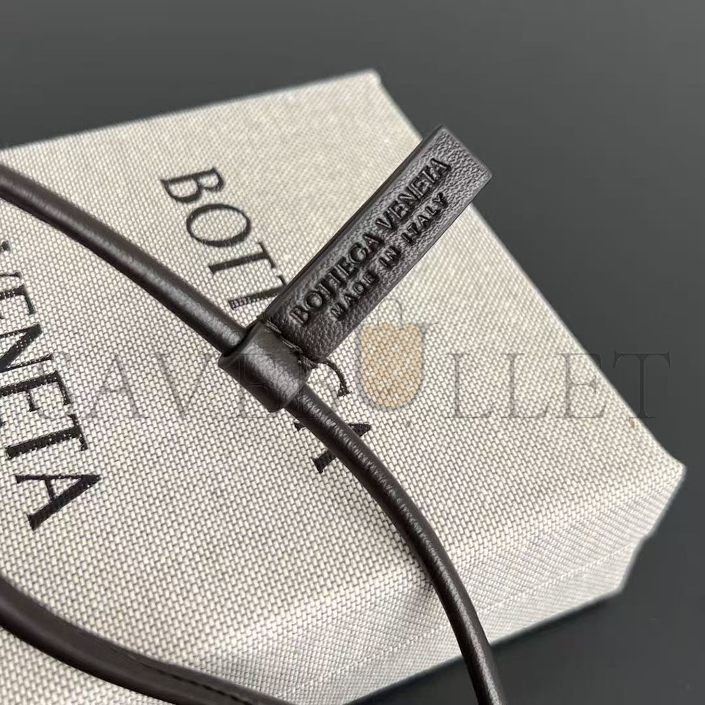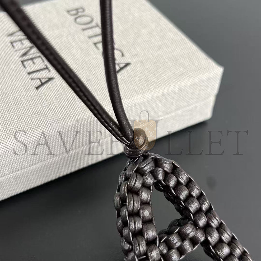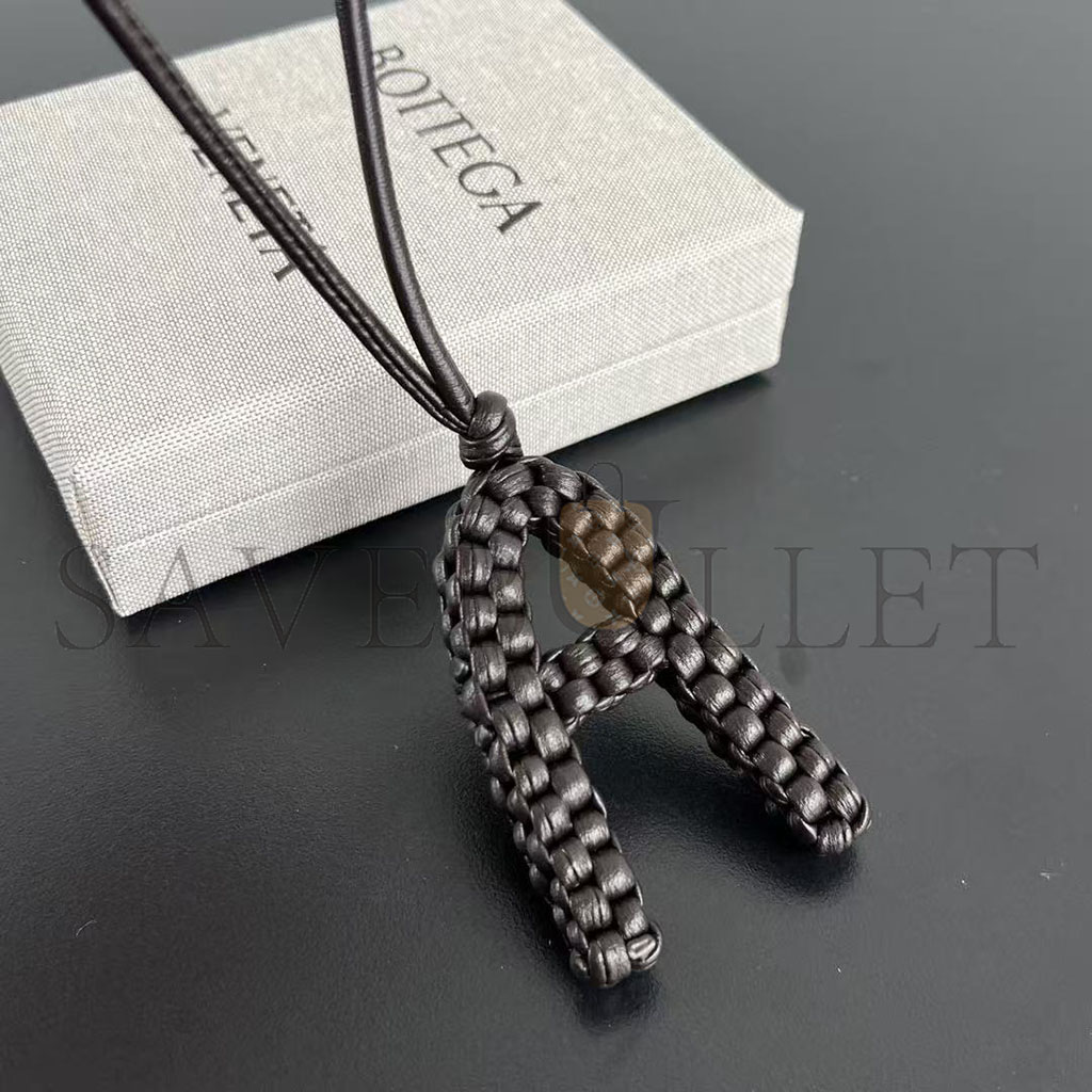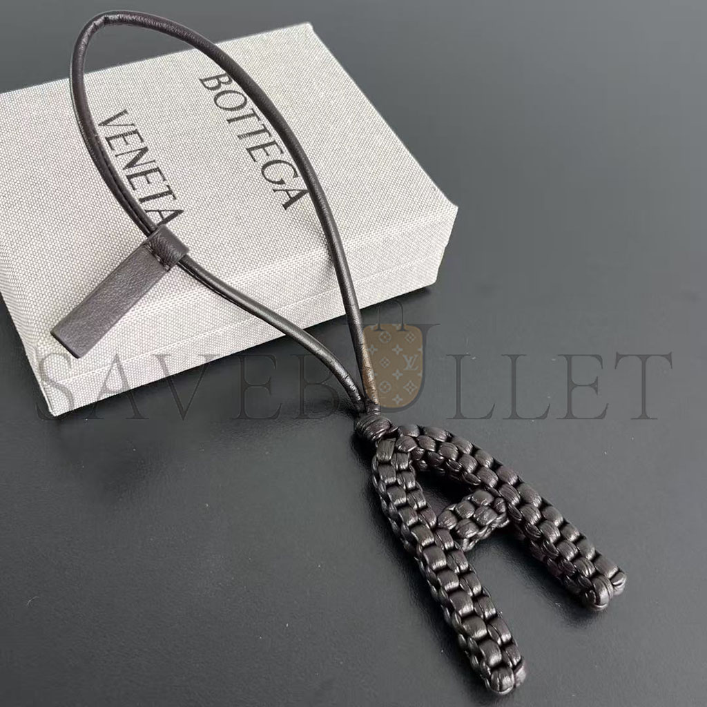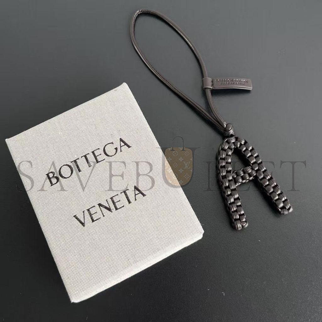 Charm realised in Intreccio nappa leather with letter "A" shape, featuring a leather lanyard.