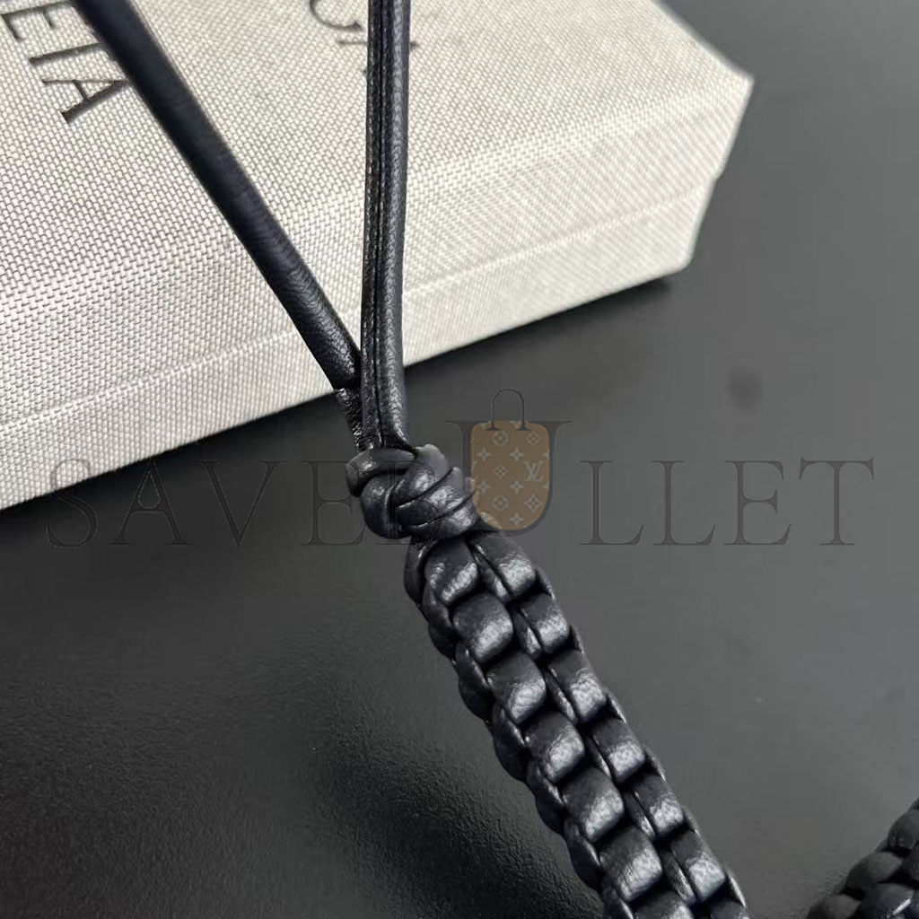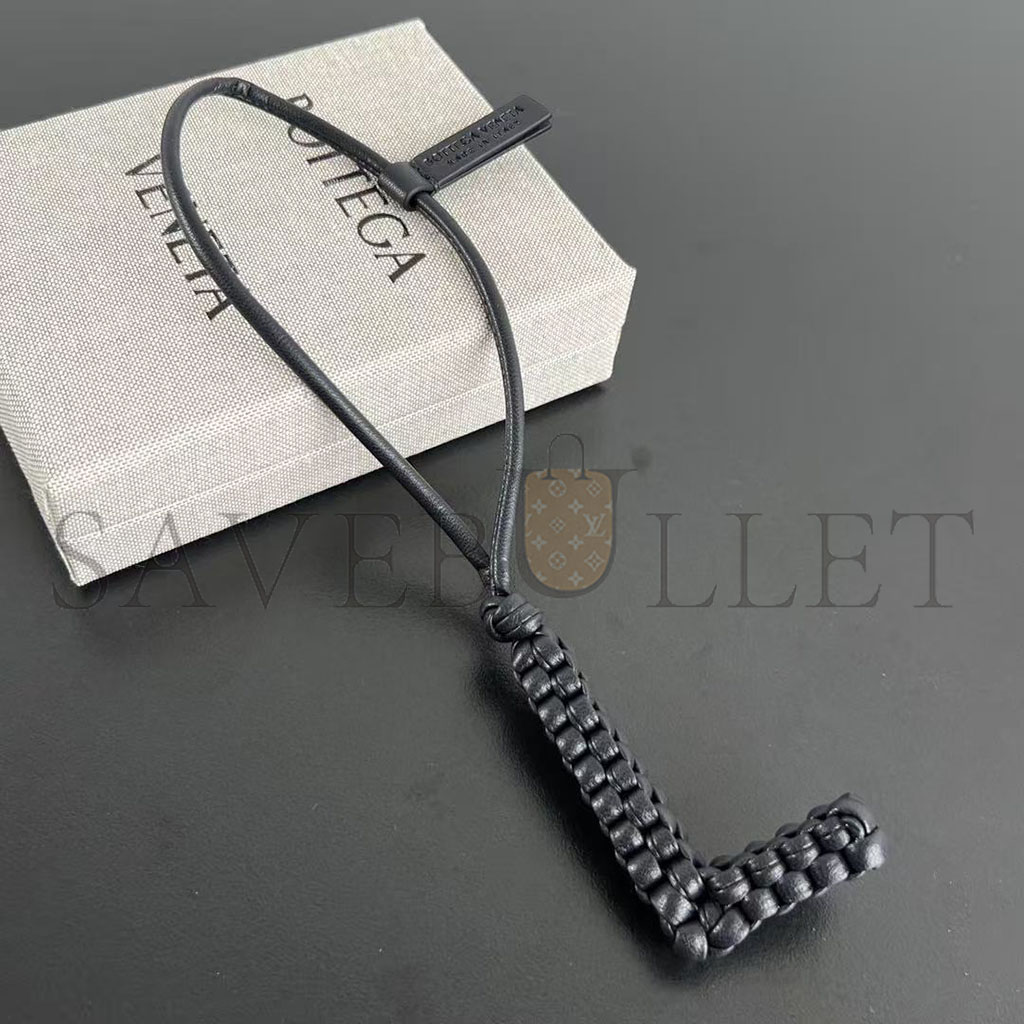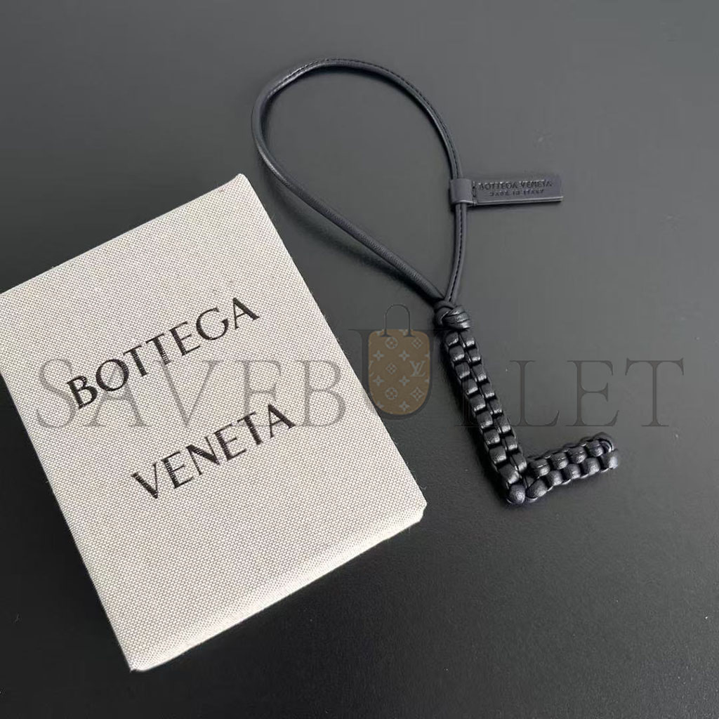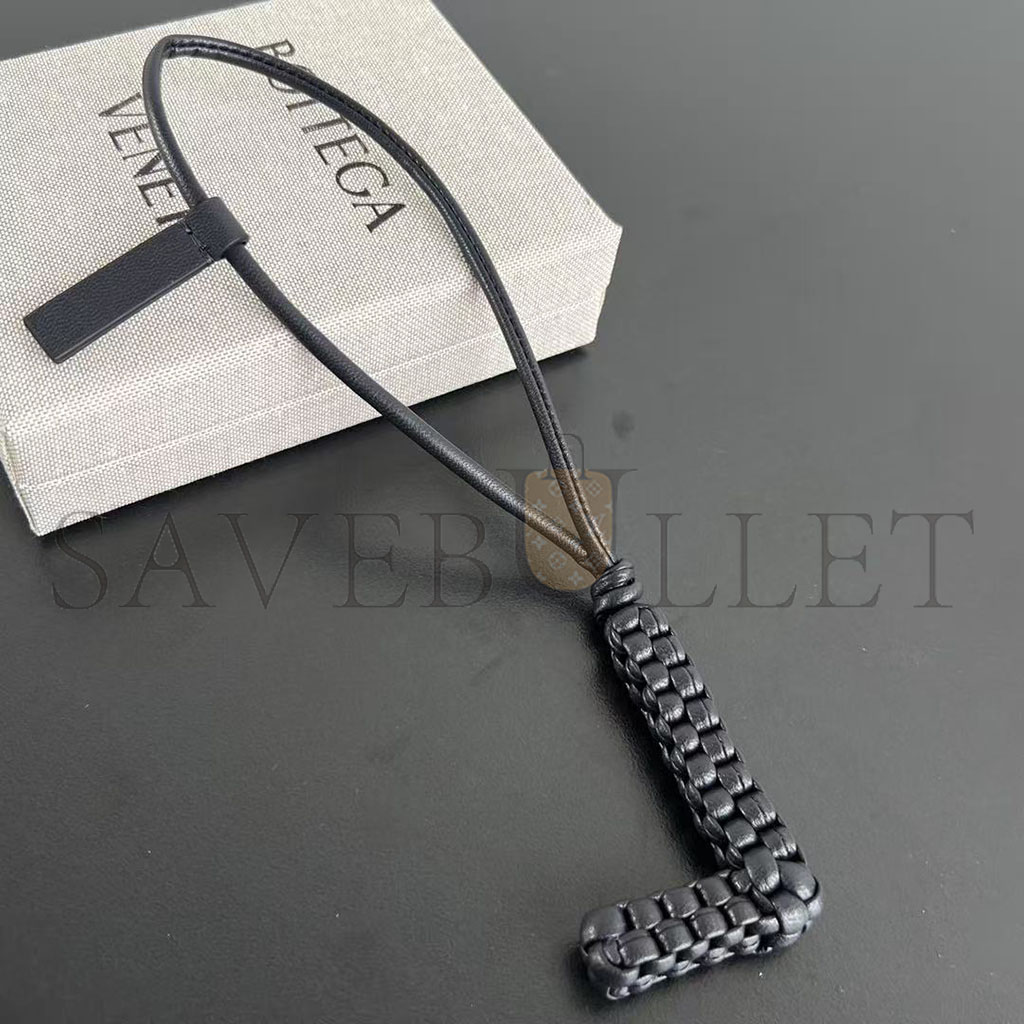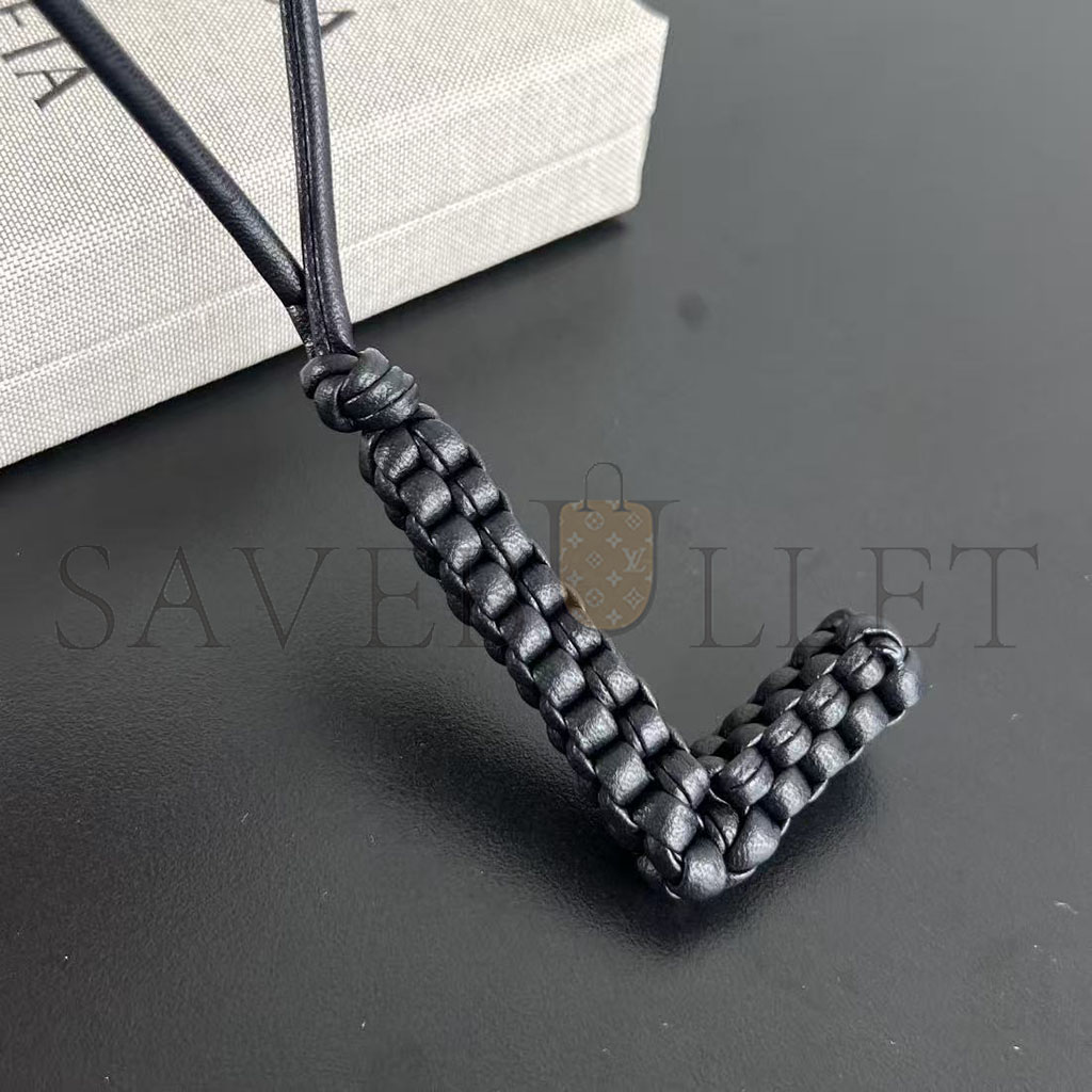 Charm realised in Intreccio nappa leather with letter "L" shape, featuring a leather lanyard.
