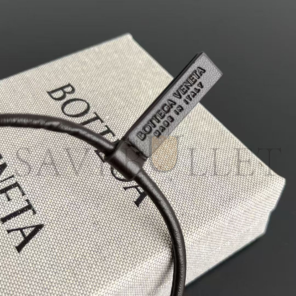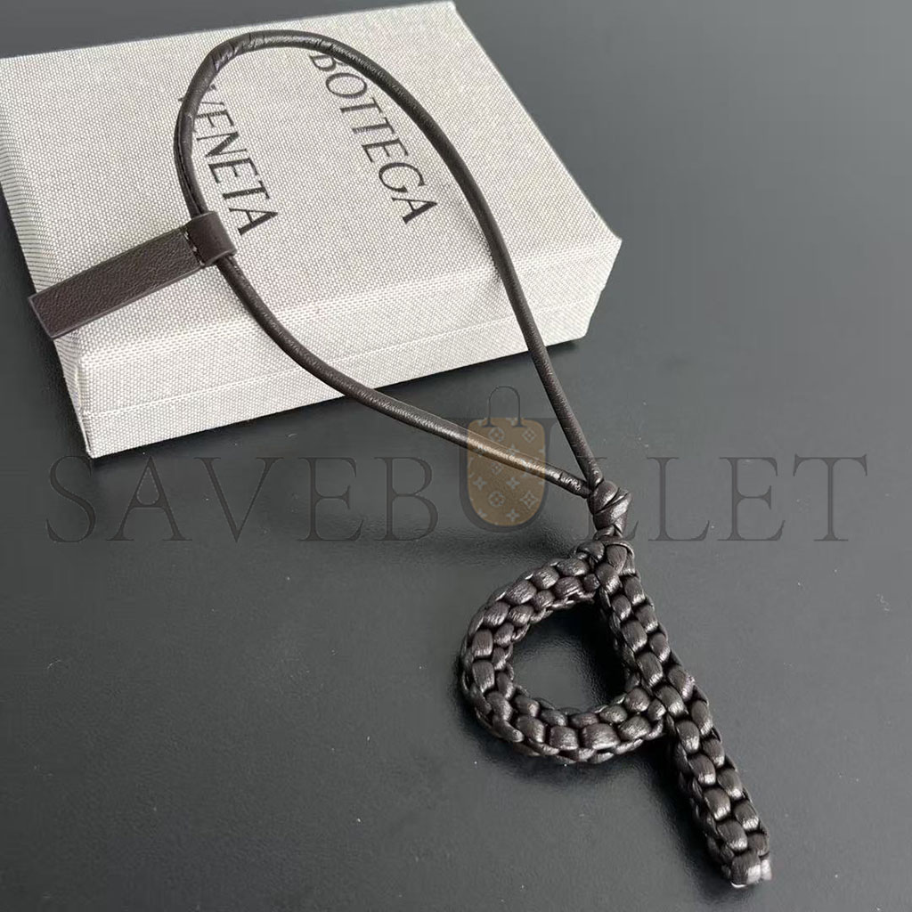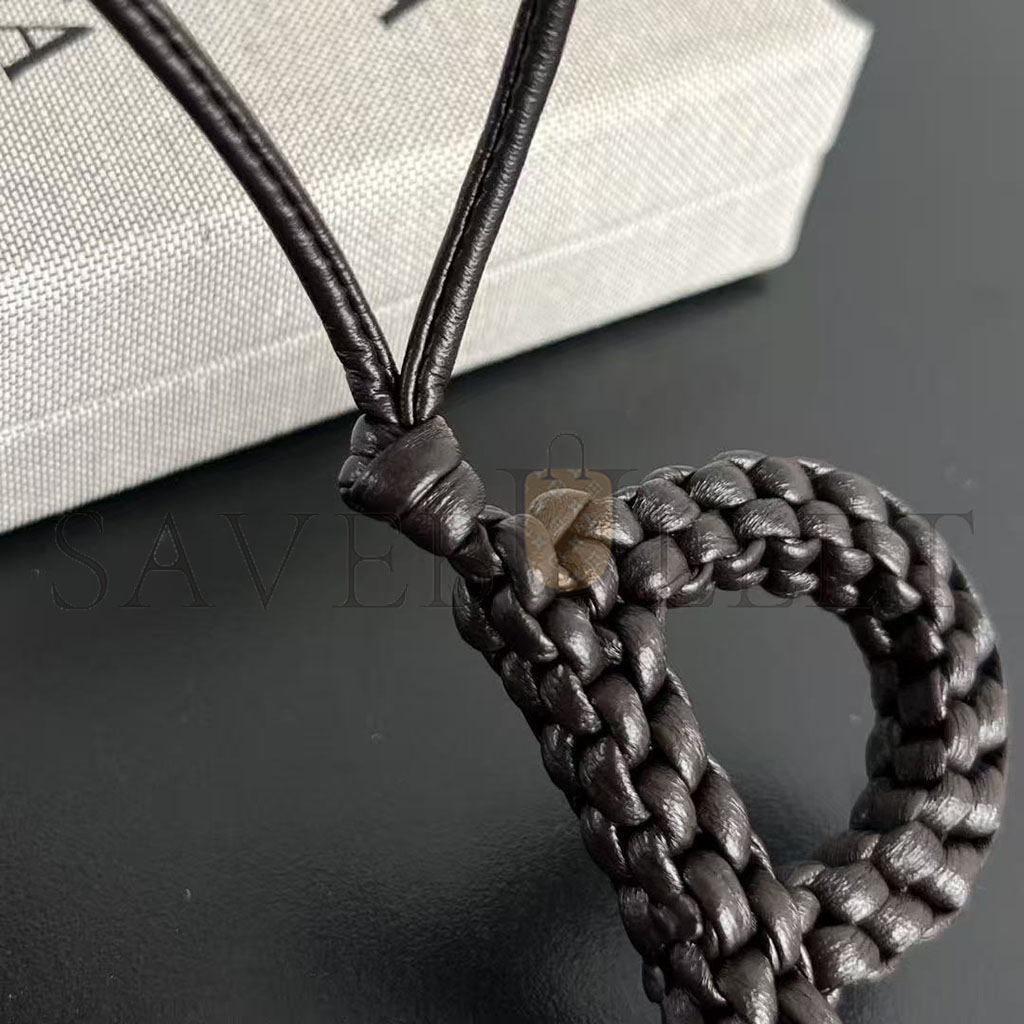 Charm realised in Intreccio nappa leather with letter "P" shape, featuring a leather lanyard.