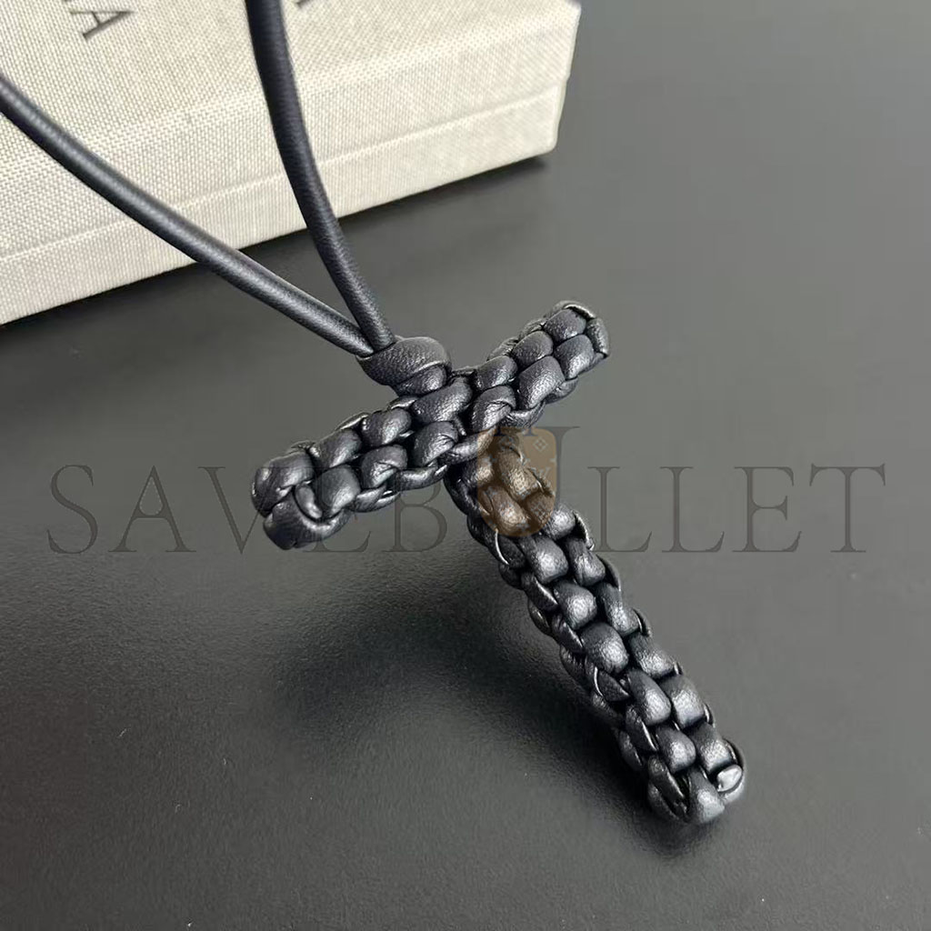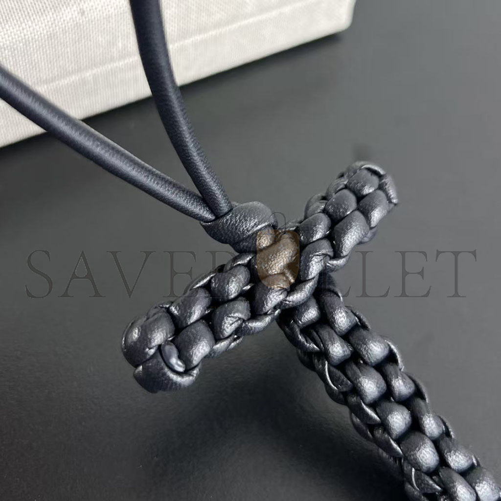 Charm realised in Intreccio nappa leather with letter "T" shape, featuring a leather lanyard.