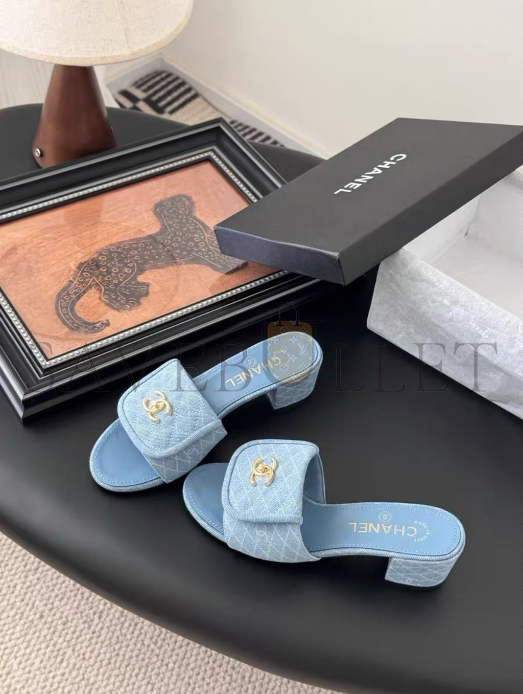 CHANEL DENIM QUILTED TURNLOCK SLIPPERS MULES
