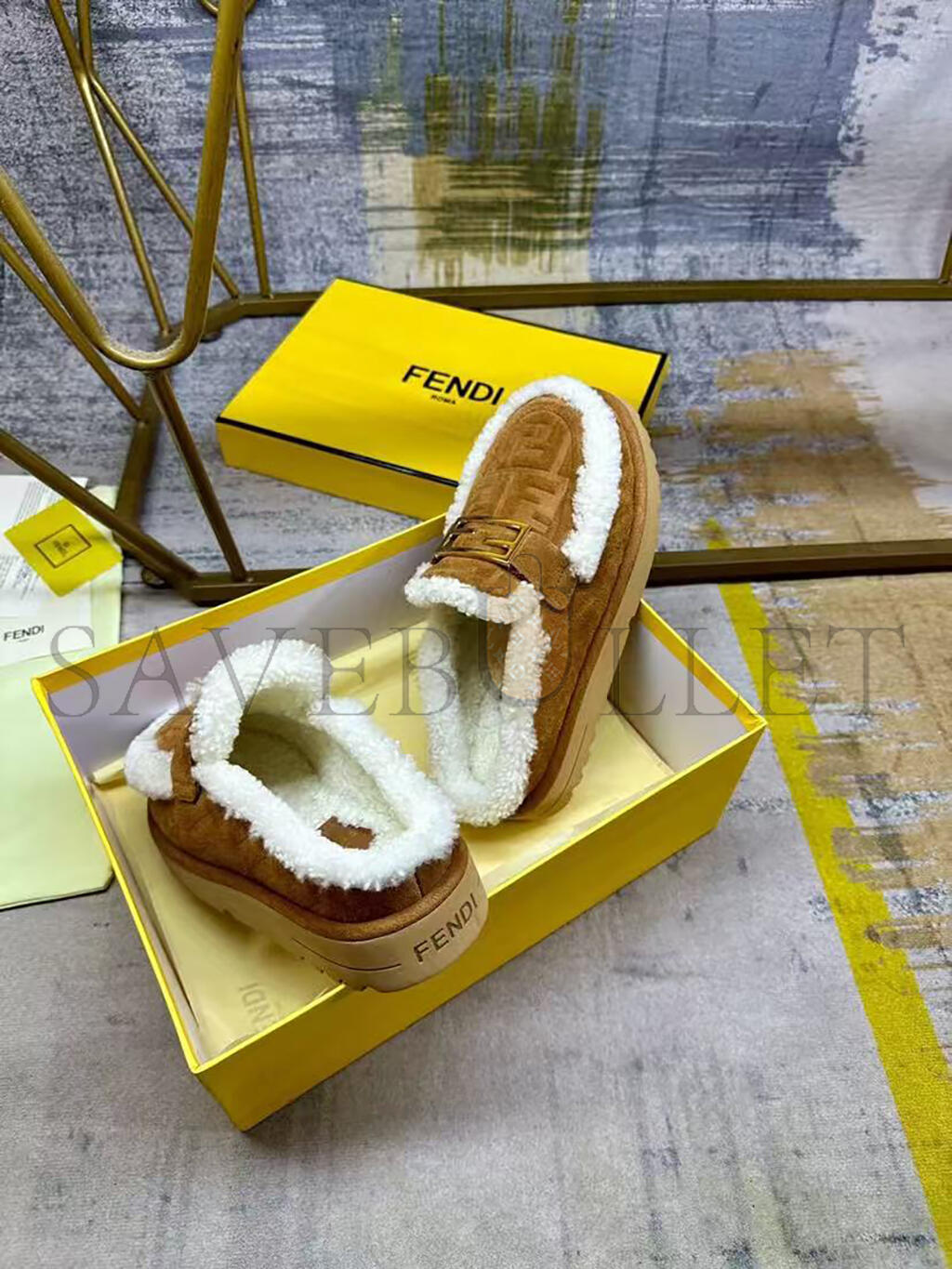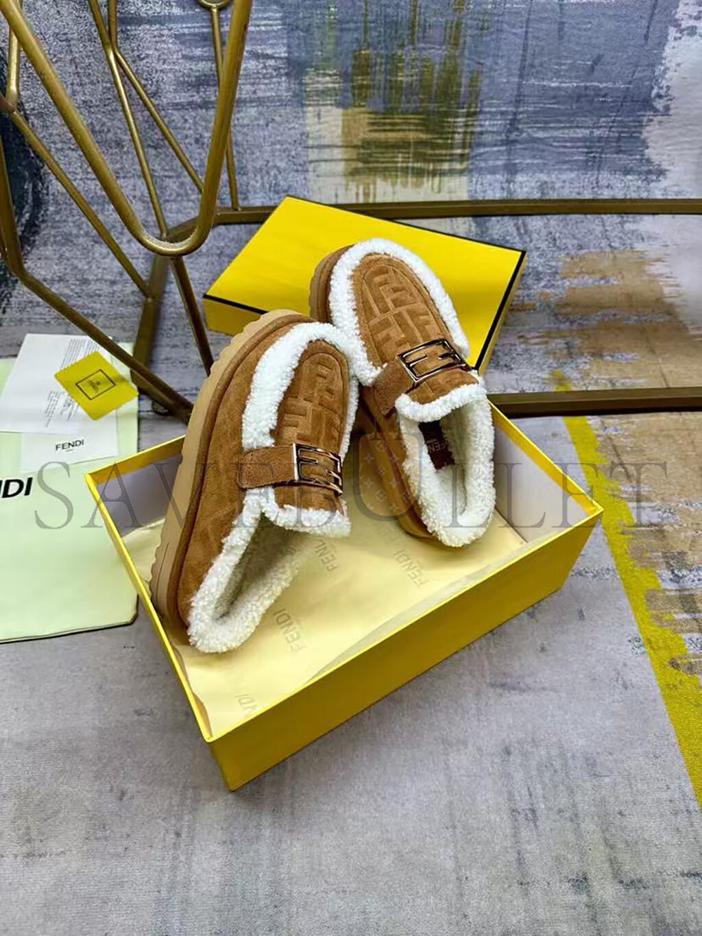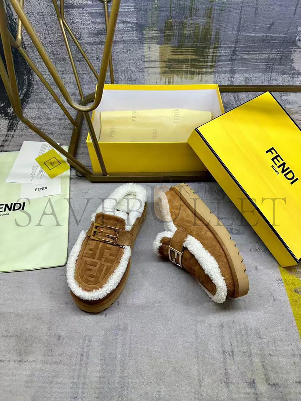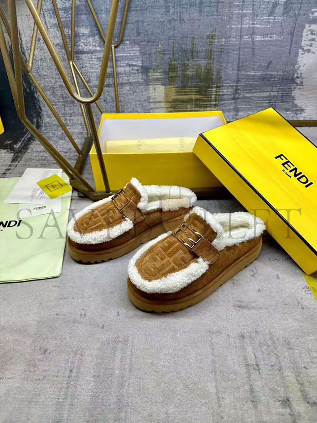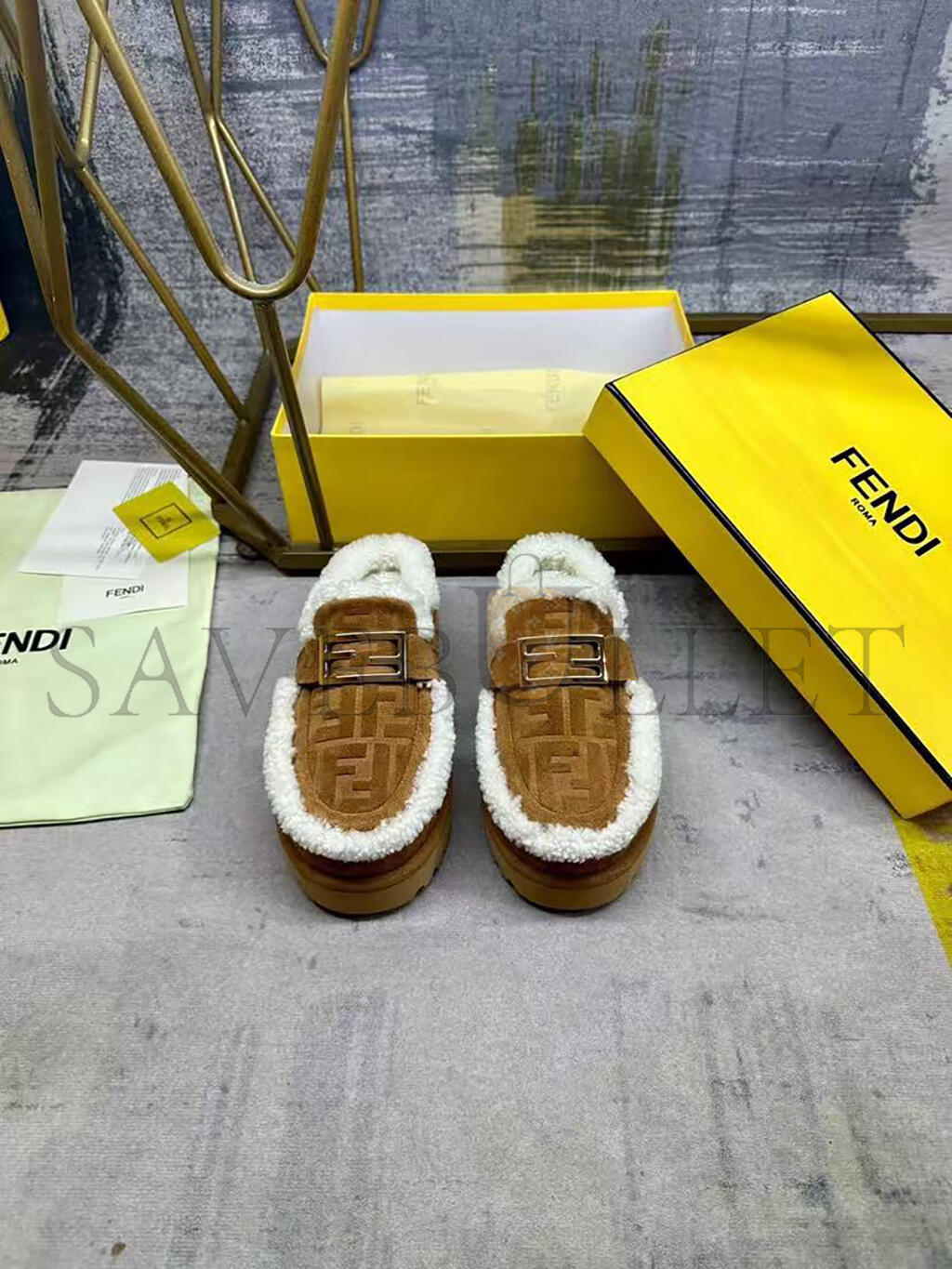 FENDI APRES CHIC BROWN FF SUEDE AND SHEARLING SABOTS 8R8777ASA1F0C23